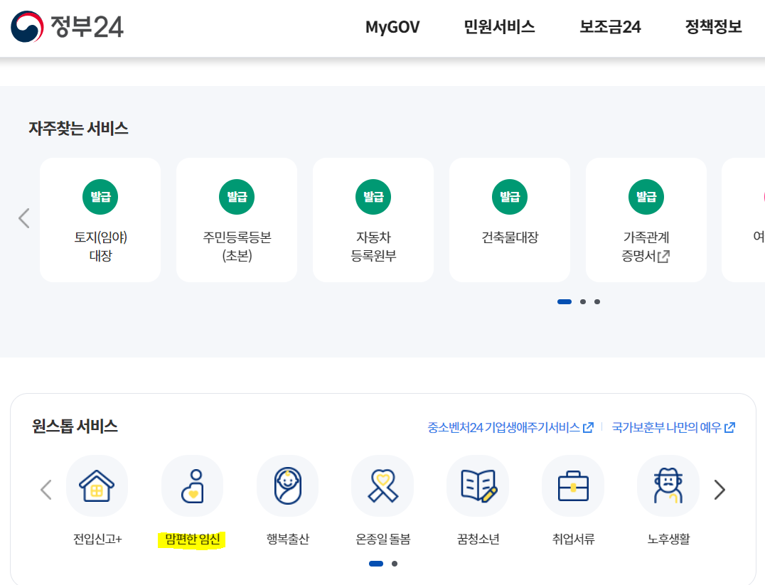 온라인 신청 시 정부24 사이트에서 ‘맘편한임신’ 배너를 클릭하고, 개인정보 이용 동의를 한 후 신청서를 작성하면 됩니다.