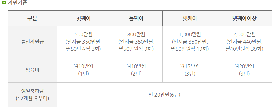 - 첫째아: 500만 원 (일시금 350만 원 + 매월 50만 원씩 3회)